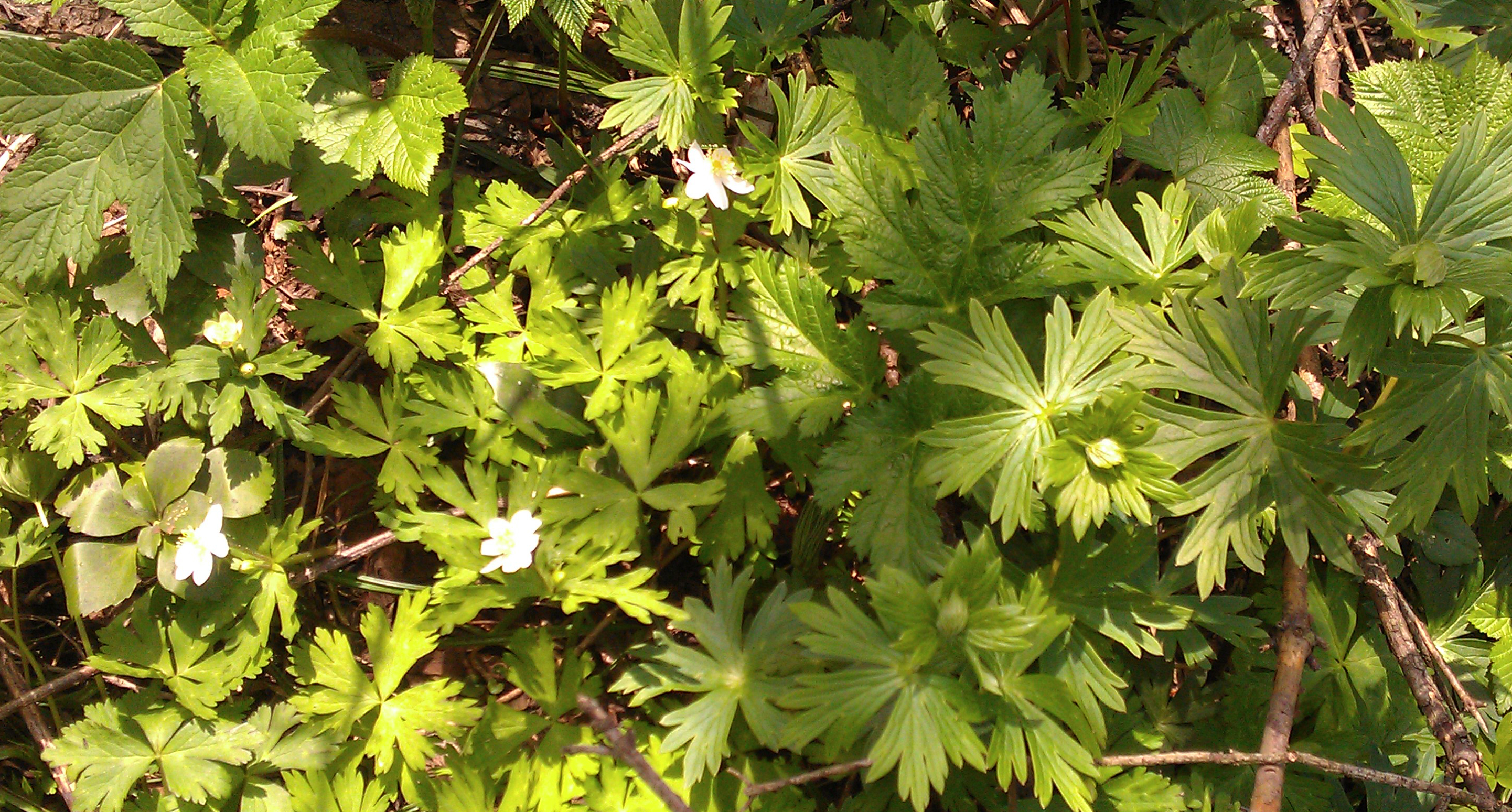 左の白い、可愛らしい花の方がニリンソウ。右のやや切れ込みが深く、色の少し暗めなのがトリカブト。似ていると言えば似ている。どちらもキンポウゲ科のイチリンソウ属だから当然かも知れない。生育場所もこのように同じところに生えている。トリカブトは既に背が高くなり始めているが、ニリンソウの花が咲く1週間前なら、もっとよく似ていたはずだ。