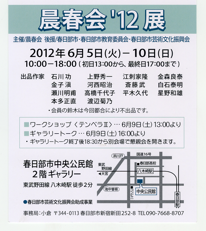 晨春会’12展は終了しました。観に来て下さった方、有難うございました。都合で来れなかった方、来年また頑張りますのでぜひ観に来てください。個人的には来月2日から銀座1丁目セイコウドウギャラリーにて「ゴチ展」に大小各1点を出品します。こちらも観て下さったら有難いです。