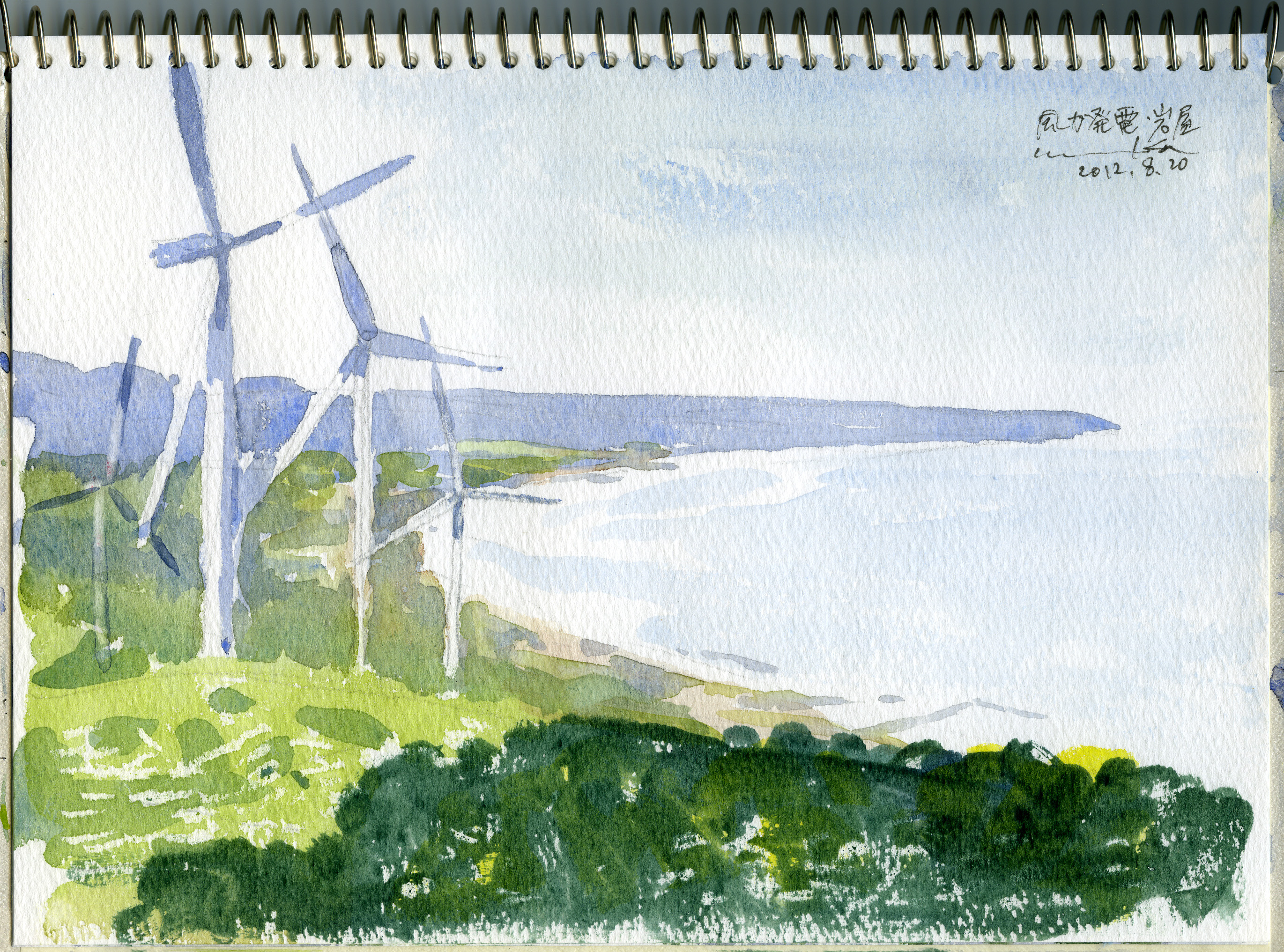スケッチは青森県・東通村岩屋地区での風力発電用風車と津軽海峡と大間崎方面を望む風景(大間崎はスケッチに見える半島のさらにその奥この日肉眼では見えなかった)。现在、この岩屋地区は日本で最も発電用風車が集中している場所だ風車の地上から羽根の付け根までが60mちょっと羽根の直径がやはり60mを少し超えるそうだからどれかの羽根が垂直に立った時その先端の地上からの高さは約100mに及ぶ巨大なものだそばに行くと低周波から五感に感じる様々な周波数の音が身体を震わせる