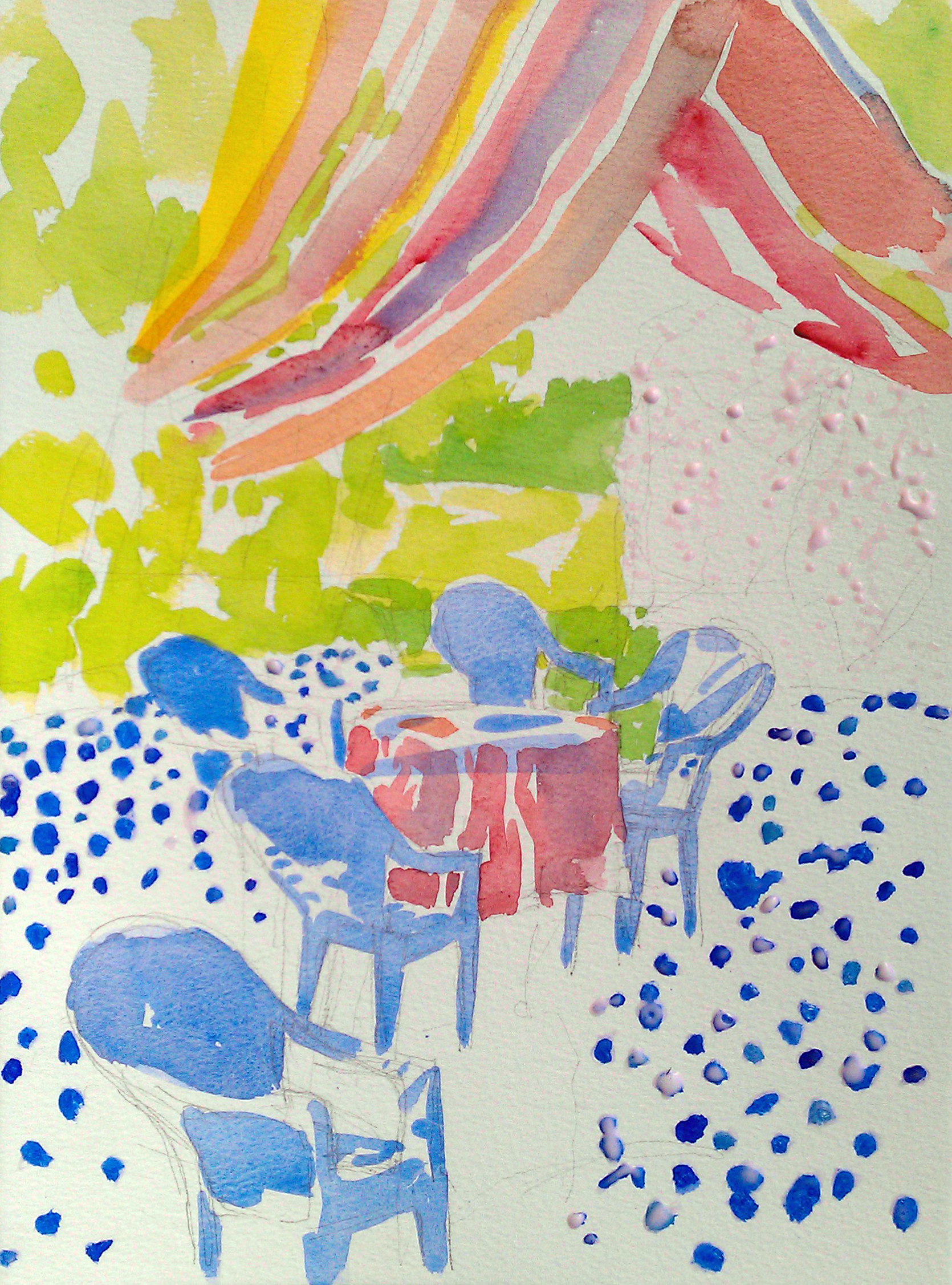 白い花。青い花になぜかとても惹かれる。青い花は数も種類も少ないせいか、特に心が動く。庭の白い椅子のシルエットを借りて、青い花や遠景、布のアーケードなどは私が勝手に絵の中に作ってみた。白い弦薔薇はここからは見えないが、実に立派なもの。一見の価値ありです。