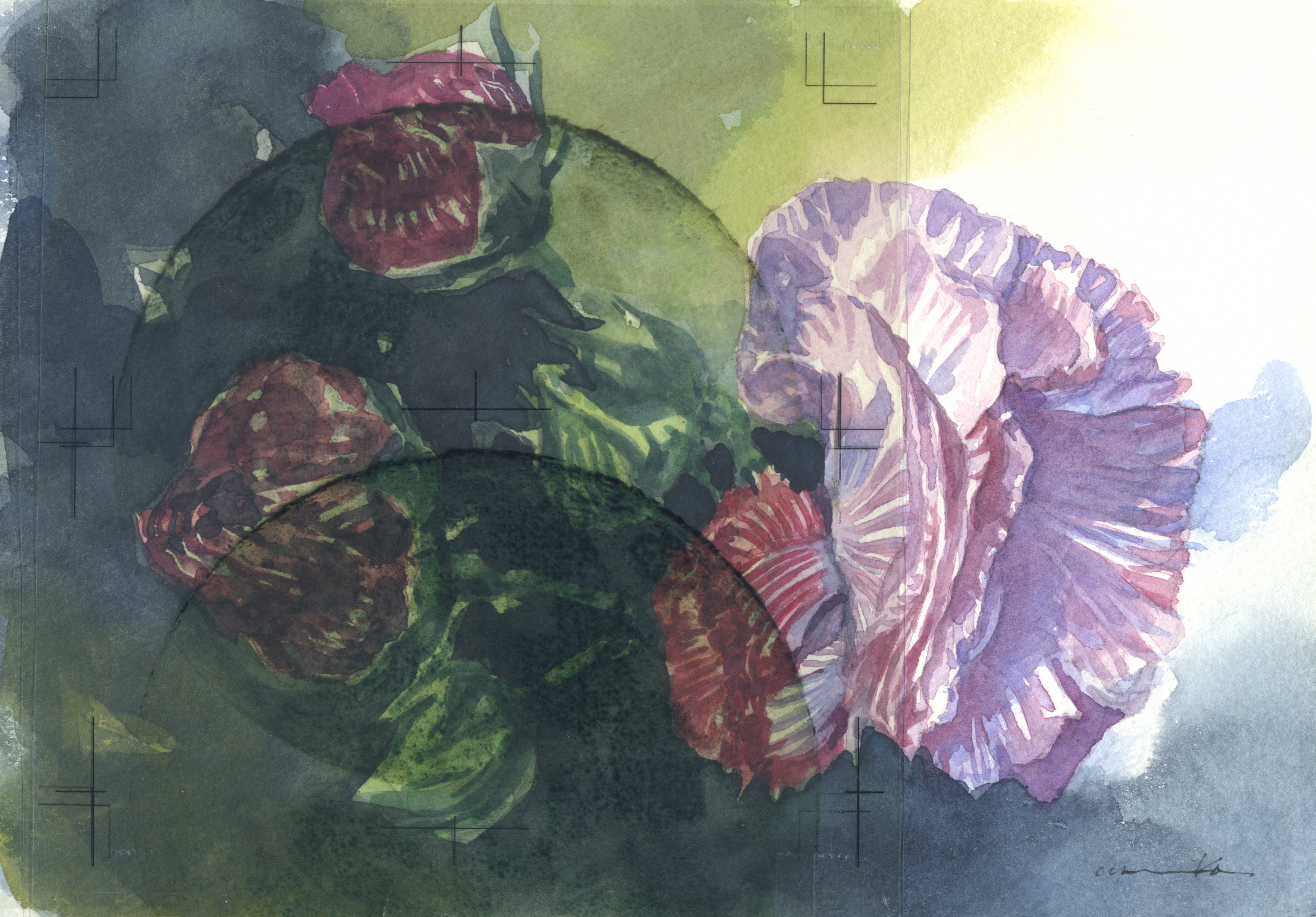 A lot of frowers of Cotton rose has came out every morning. That’s White flowers were beautiful in a ray of mornig , and then increasing deeply red into them was also beautiful sensuality. But I mostly haven’t painted picture of them.