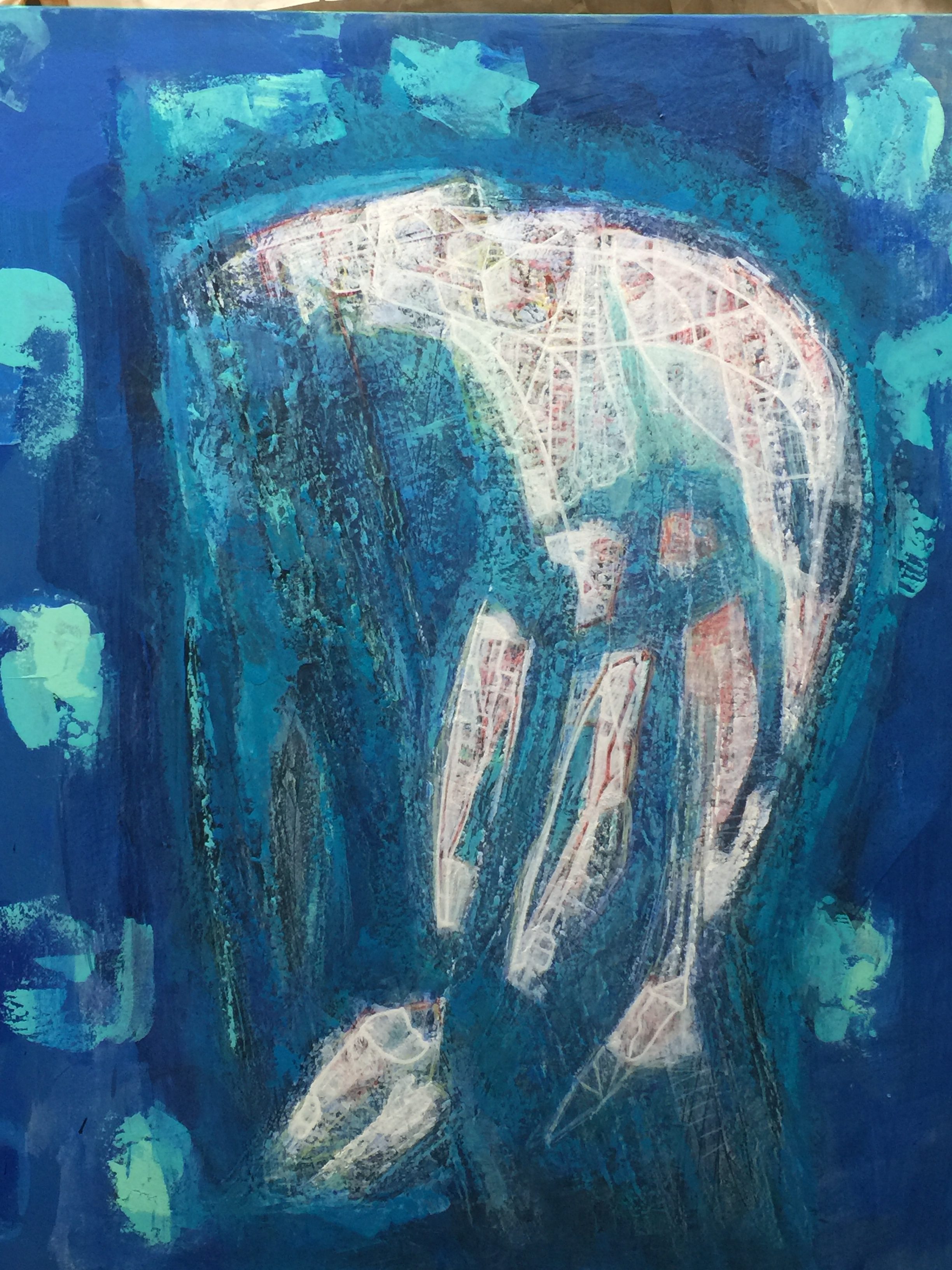 ただいまの制作-2 降りる男(仮題) 赤や青、黄の線が入ってきた。白い線は一層はっきりし、道のように見えてきた。 「男」は、「見立て」であって、そのように見えれば良いというだけで、そう見えなくとも構わない。صرف、白い線が道のように見えることはこの作品にとってはもっとも重要なことのひとつ。