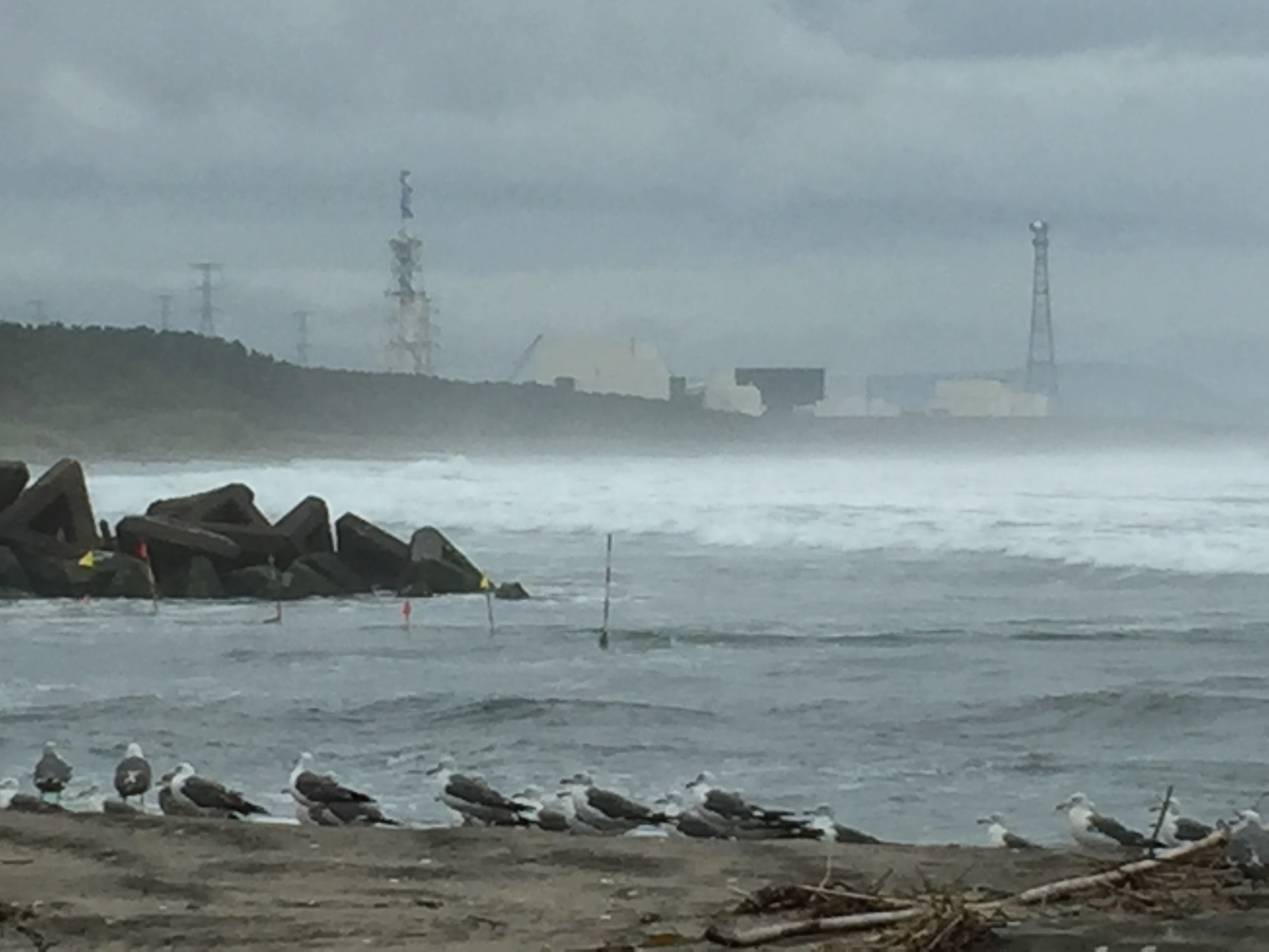 今日は曇り 原発とカモメ Bu sabah biraz yağmur yağdı。Dalgalar da biraz yüksek。Haliçin ağzında bir grup martılar toplanıyor。Arka Higashidori nükleer santral。