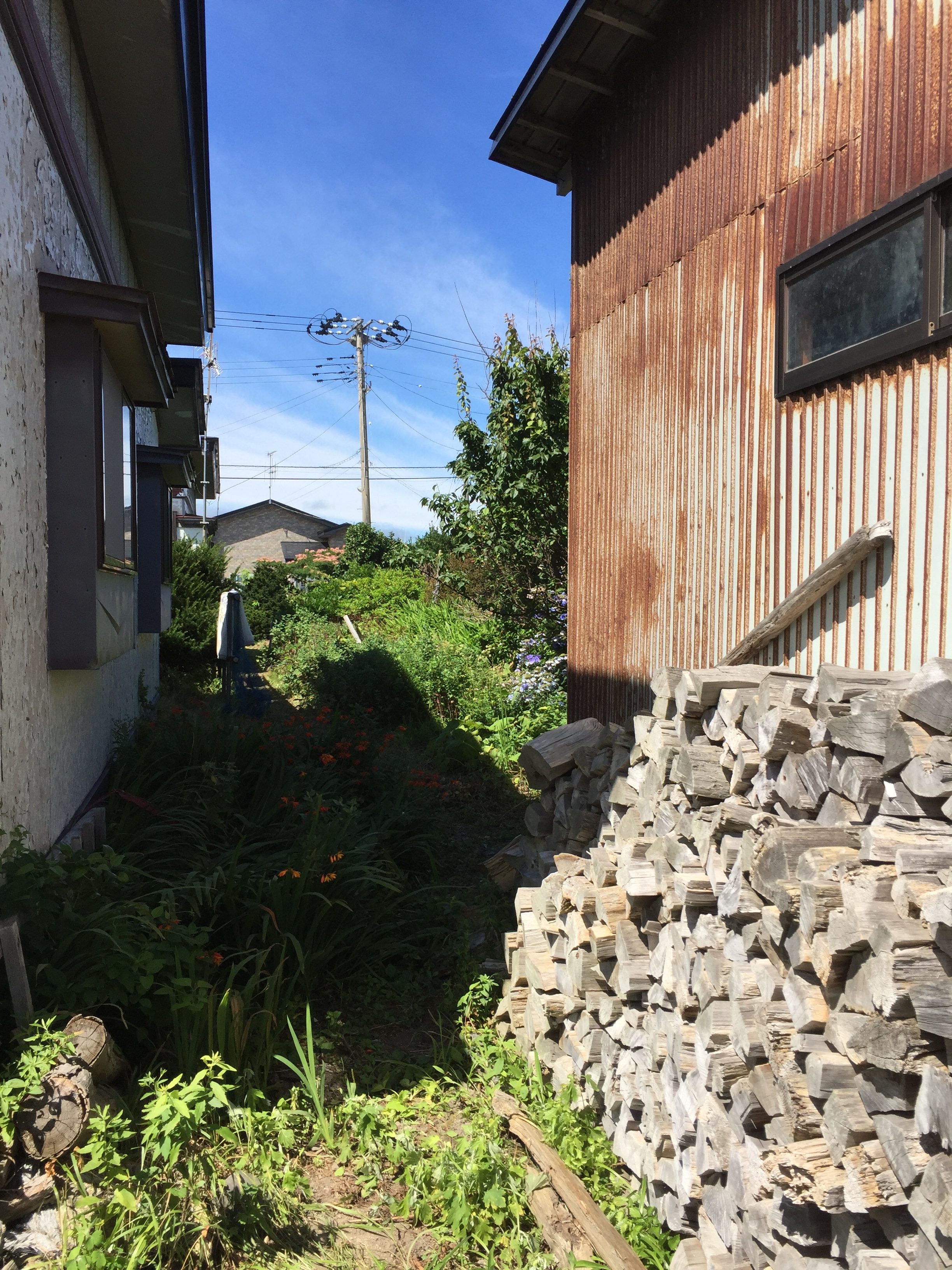 我が家の南側の庭から北を見ているところ。正面は他人の家。右側の小屋が薪(まき)小屋兼物置。積みあげてあるのは冬用の薪。薪を斧で割り、積み上げて乾燥する。4年前に他界した父が割った薪だ。小屋の中にはもっとうず高く積んである。En、もうこの薪を燃やす人はいない。