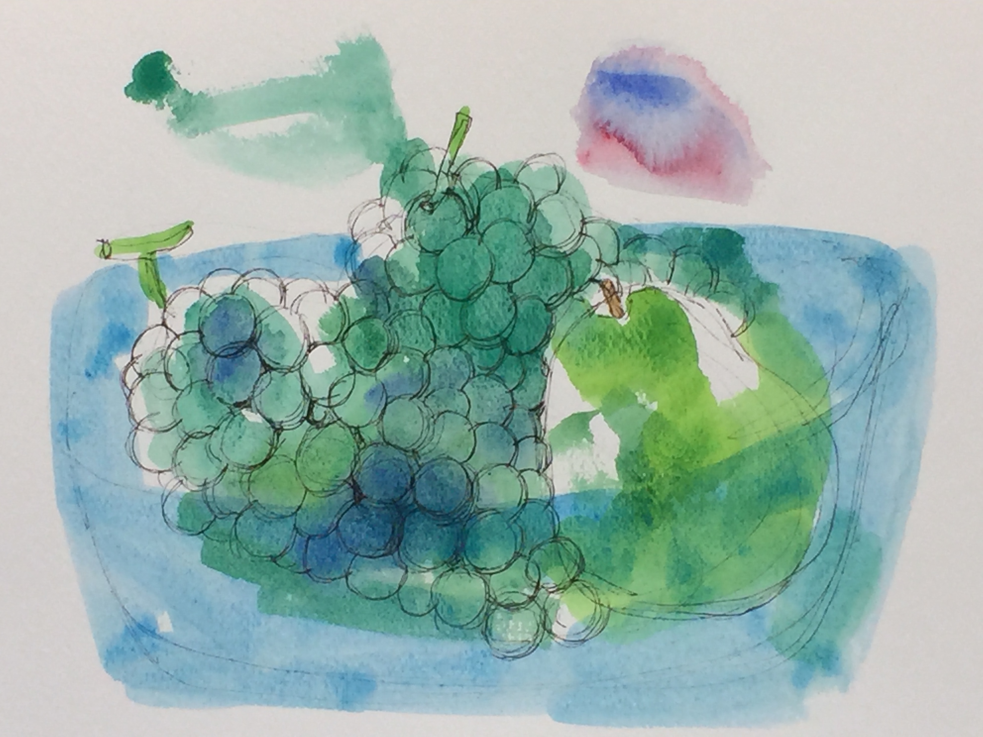 また水彩 / water colour 葡萄と西洋梨 Grapes and a pear 30En udfordring er at afslutte på få minutter。Jeg er klar over, at der er nogle dele, der mangler.。Vi lægger ikke vægt på billedet af motivet.。Kun "følelsen af at trække vejret" på papiret (dette er hele verden)。