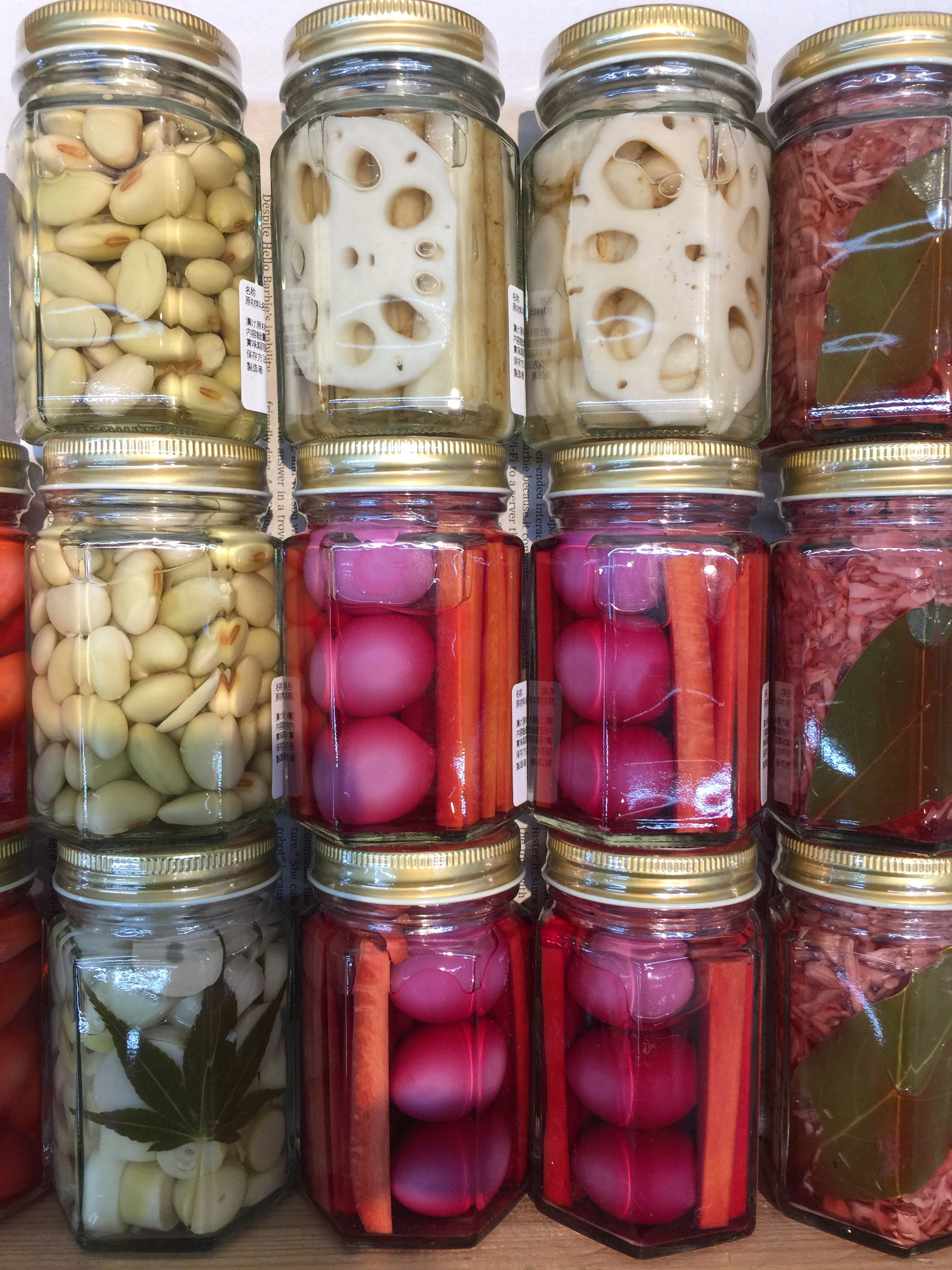 ფოტოზე ნაჩვენებია მაღაზიაში გაწყობილი მწნილის ქილები.。ლოტოსის ფესვი、რაკიო、სტაფილო、ბამბუკის ურტყამს、სოიო და ა.შ.。ფორმაც საინტერესოა、თქვენ შეგიძლიათ ისიამოვნოთ მხოლოდ ფერების დათვალიერებით。
