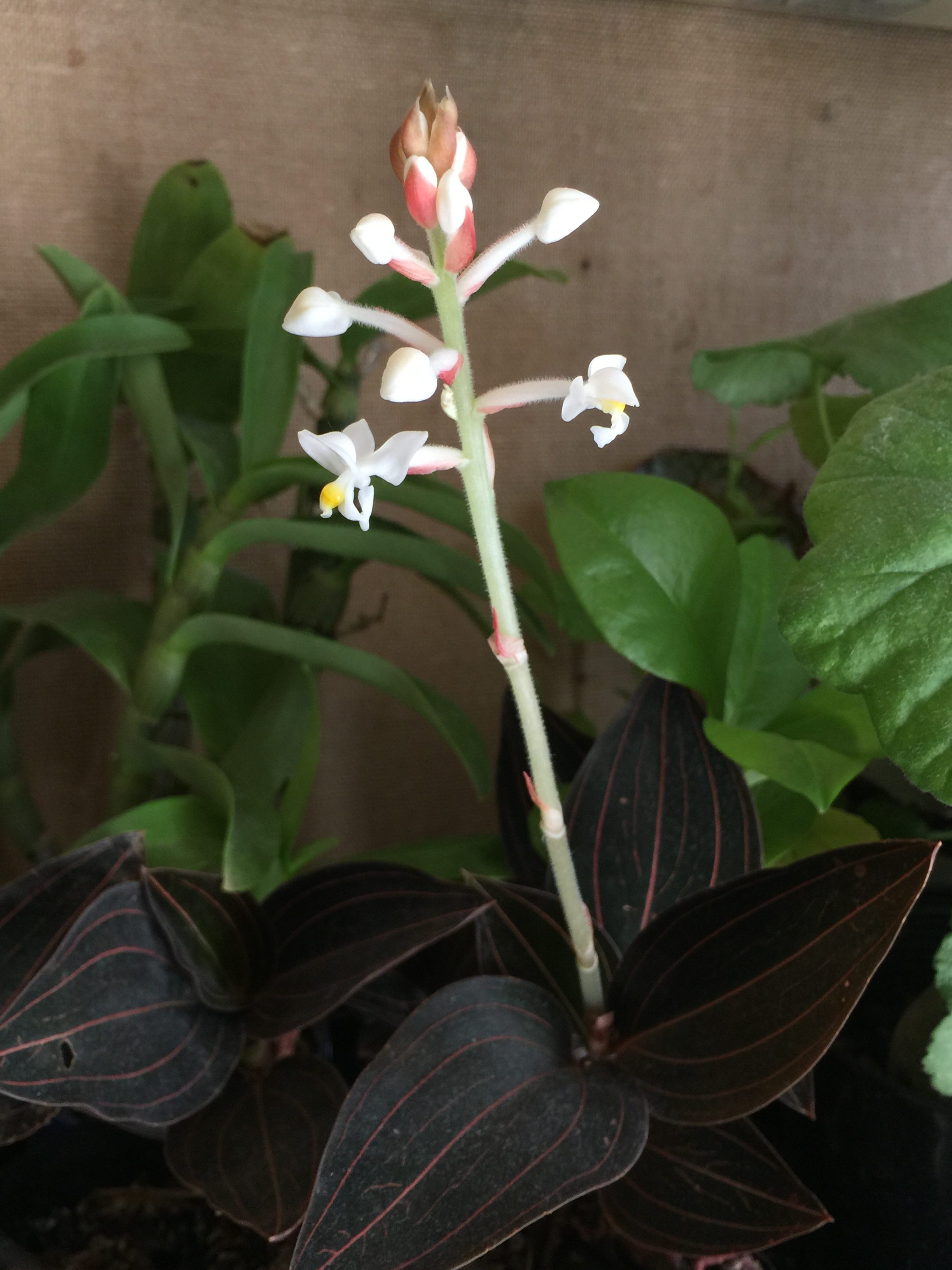 繻子蘭は(写真では見えないが)葉の下に蛇がくねるように太い茎が低く伸びていく「這うように」と言ってもいいかも知れない葉はやや厚く表面にはビロードのような光沢がある深く濃い緑の葉の中に赤い葉脈が付け根から先端まで幾筋か平行しているのも絵的に美しい寒いところが苦手でだいたい人と同じくらいの温度が好きらしい