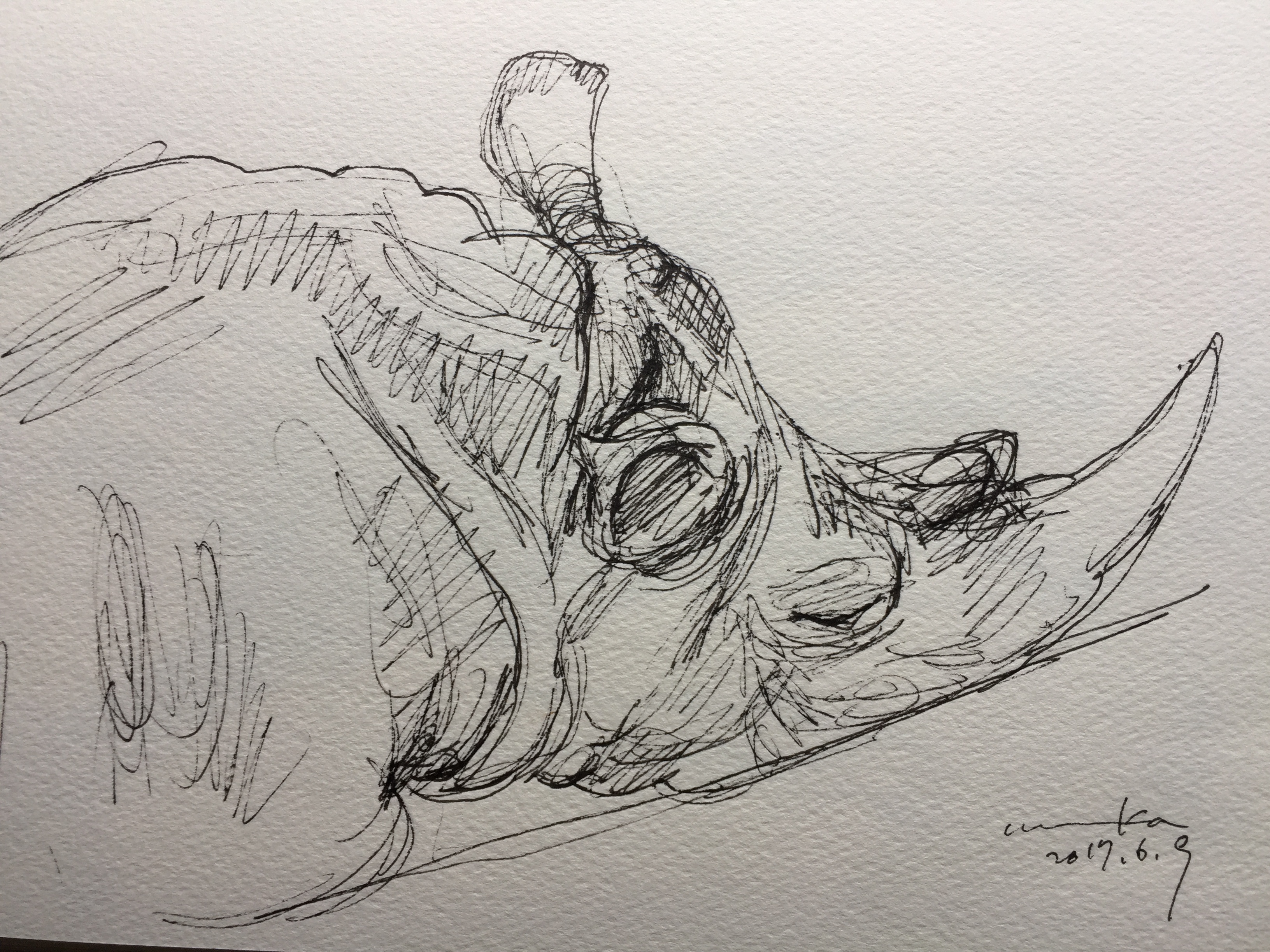 寝かせてくだサイ 「サイ」東武動物公園にて 今日は、埼玉県宮代町の東武動物公園にて、「動物をスケッチする」。朝は曇り空で、絶好のスケッチ日和だと思ったが、いかんせん晴れ男、やがてカンカン照りにしてしまつた。 人も動物もグッタリ。カバなど、水に潜ったきり浮かび上がらない。死んでいるのでは?と思うほど。অজান্তেই、アシカのショーなど観て、遊んでしまったが、アシカより、ショーを実演・訓練する若い職員たちの、大変さを微塵も感じさせないプロフェッショナルに拍手した。