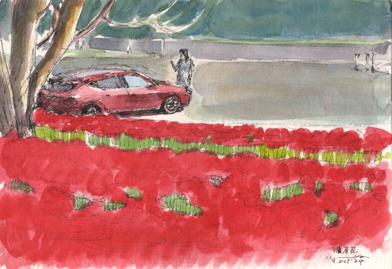 一つ一つの花を描いても「彼岸花」にはなりませんその前に個別の植物学的分類というものがあって(それ自体も「揺れ動く」のですが)「彼岸」という仏教用語に繋がる歴史的環境的意味関係をいったんは断ち切りますそれを踏まえたうえで秋の彼岸の時期にまとまって咲くこの花の全体としての存在が「彼岸花」だというのならまとまった花の「情景」こそ「彼岸花」ではないかなんて理屈を捏ねてみた試作です