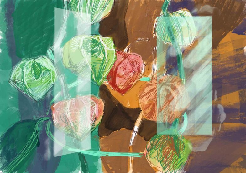 なんとしても鬼灯(ほおづき)を一枚絵にしたいと、夏の間ずっと考えていた。鬼灯に特別な思い入れがあるわけでもないけれど、なんとしても乗り越えたい手ごわい相手。これまで何度も挑戦したが、すべて「返り討ち」されてきた。