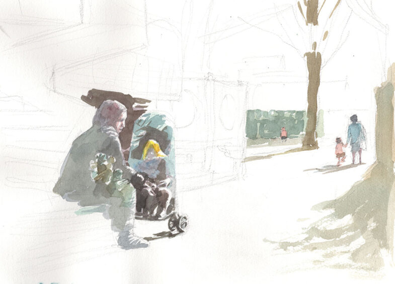 わたしが自分で撮った写真から描き始めている。ここには描かないが、真ん中に“見張り役” の人がいる。東京のド真ん中での、とある日常生活。