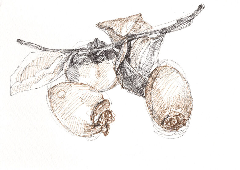 柿は美味しい。夢中で食べてしまってから、アッ、今の描いておくんだったと、もう最後のひと切れが喉の奥に落ち込む直前になって思いつく。なんでもそう、目の前のことだけになってしまってはいけない。
