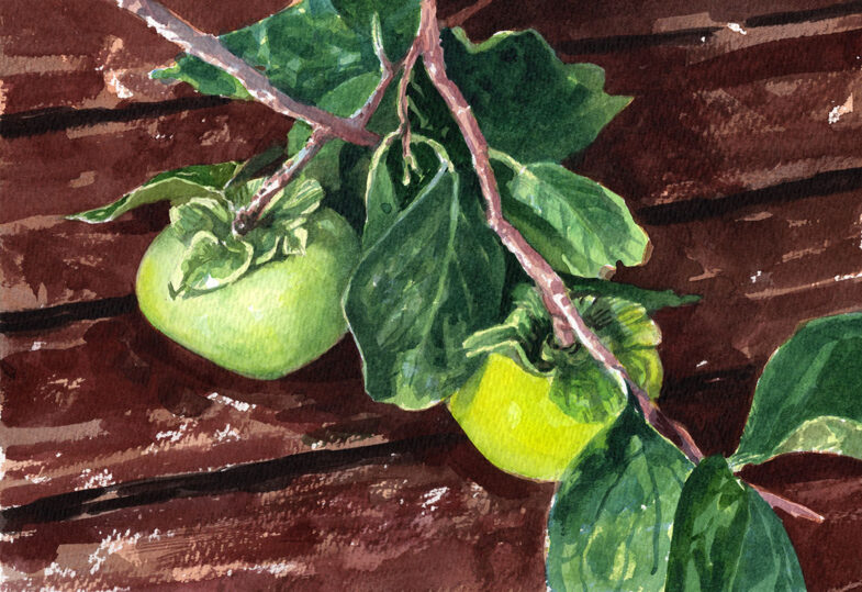 今日はぐずつき気味の天気だったが、涼しいのは良かった(人によってはかなり冬支度に近い人も診かけた)。青柿が、赤い柿より絵になりやすいことは先日書いてしまったので、今日はそれについては書くことがない。とりあえずスケッチを載せる。青柿だから、柔らかくなりすぎるとか、食べるための心配は無用だから集中できる。