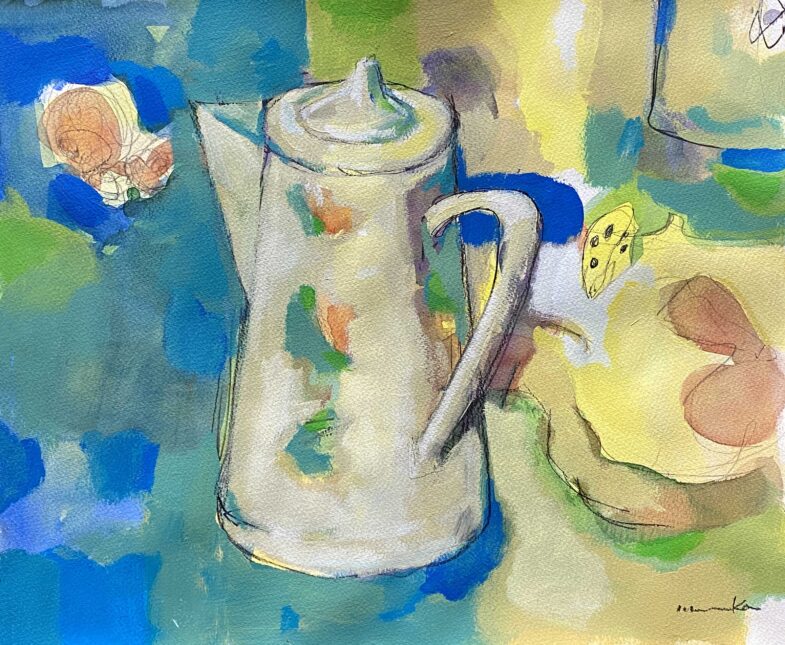 この絵は数年前に水彩で描きかけたままほったらかしだったポットの周りにあるモノはそれがなんだったかもう覚えていない。dar、面白いかたちをしているので得体の知れないまま残すことにした水彩の色もなるべく残しながらアクリル絵の具を重ねてみた