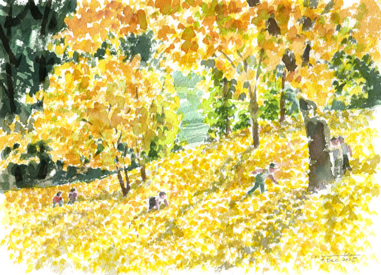 ここ、いつもの散歩コースの途中。あまりに黄葉(大きな銀杏が隣に数本ある)がきれいだったので写真を撮った。別の日、別の場所で、子どもが銀杏の落ち葉を手で掬い上げ、空中に放り投げてはそれを頭から浴びていた。そんな情景を画面上でミックスした。