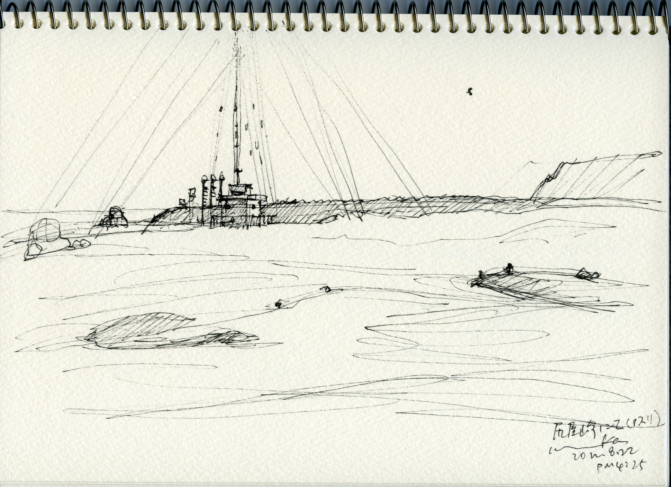 スケッチは、太平洋を眼下に望む尻屋崎灯台から、南へほんの少し離れたところに建っている、高さ数十mのアンテナとその基部を描いた。基部の構造物はちっぽけな、コンクリート製の装置室。אָבער、なぜかここへ来るたびに、(有名な灯台を描かないことはあっても)必ずこのアンテナは描きたくなる。何かが無性に心をかきむしる。小学四年生のバス遠足で、初めて来た時もこれを描いたのを覚えている。このアンテナを見ると、今でもその時とほとんど同じ気持ちになるから不思議だ。